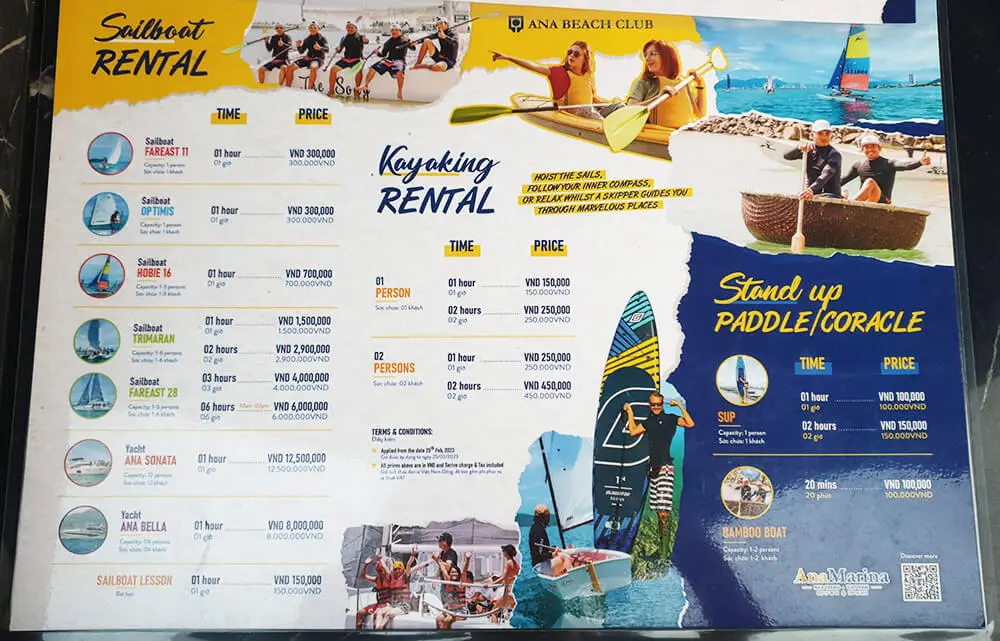 Если идти южнее от центральной площади, то наткнетесь на ресторан Sailing Club. У него есть своя пляжная территория, а также слева от ресторана есть бар Blue Sea. Здесь можно арендовать шезлонг за 50.000 донгов, а вот кокосы за 40к, это уже перебор. Справа от ресторана, можно расположится самостоятельно или тоже арендовать шезлонг. (см. на карте)