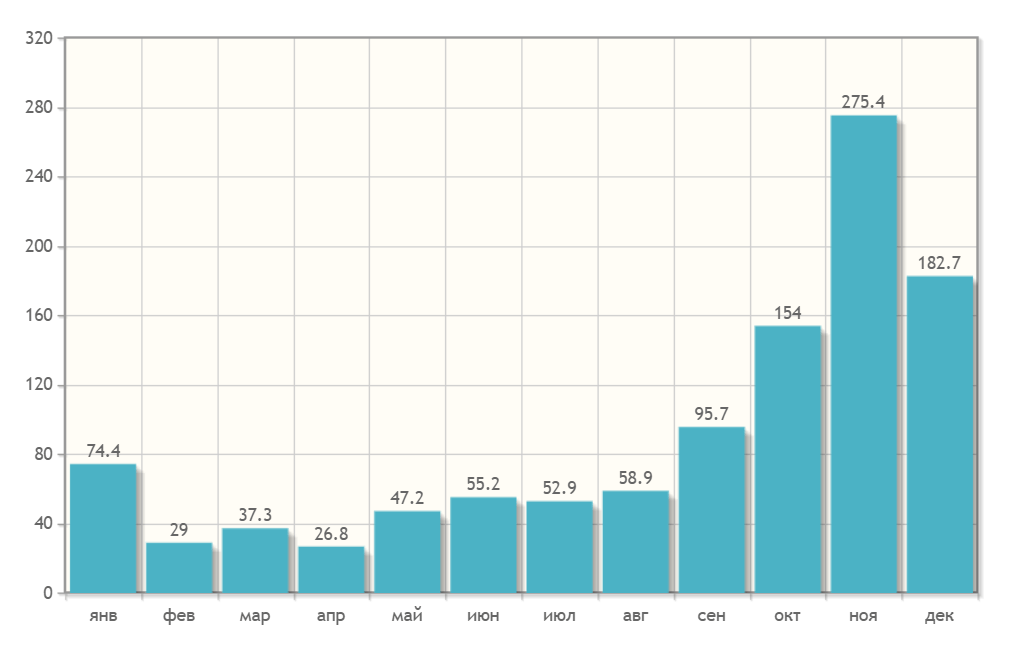 Как видно из графика, самая комфортная температура воздуха в Нячанге с марта по апрель, а также с сентября по октябрь. Но, в сентябре начинается пора дождей и количество осадков начинает возрастать (см. график ниже).
